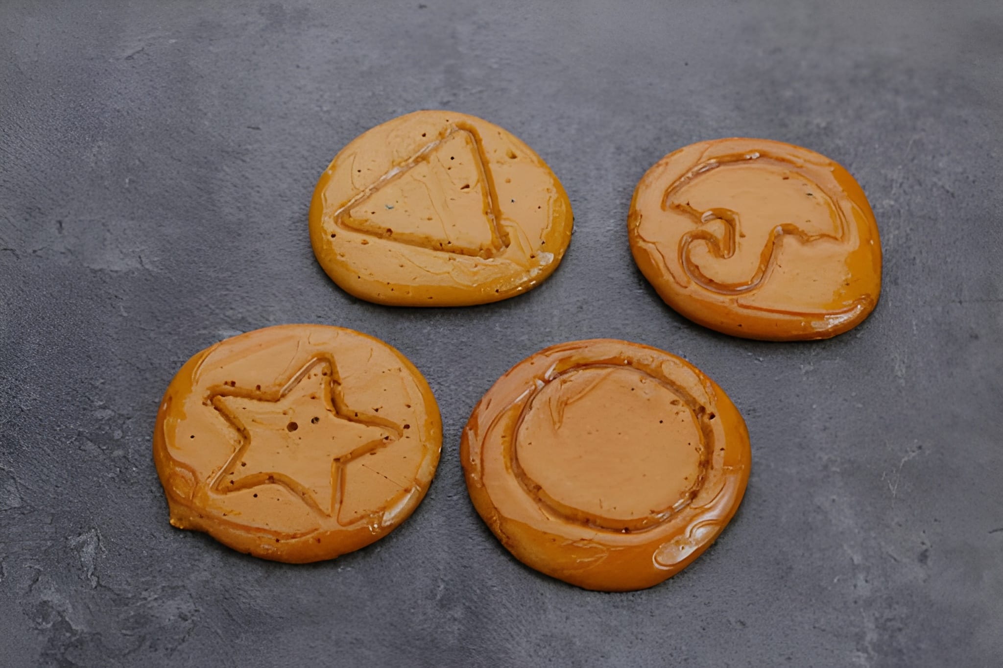 Once it reaches the desired hue, quickly add bicarbonate soda and whisk vigorously. The mixture will expand dramatically, turning frothy and light. After a brief rest, spoon the foamy syrup onto a silicone mat in even portions. This stage demands swiftness — the candy begins to set almost instantly. Lightly oil a metal press or flat-bottomed bowl, then flatten each candy to about half a centimeter thick. While still warm and pliable, press in your chosen shape — a star, circle, or heart — for a signature finish. After cooling, the candies harden into beautifully glossy, brittle disks ready to enjoy.